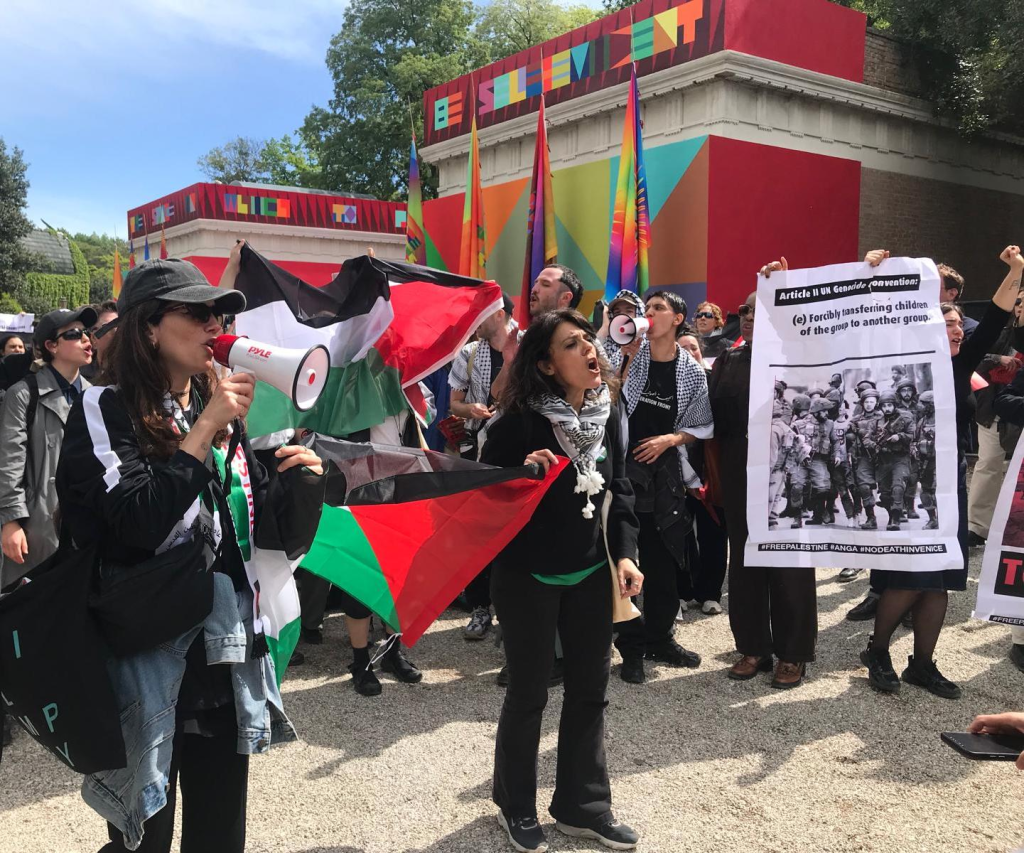 ВЕНЕЦИЈА — Над 100 уметници, работници во областа на уметноста и активисти организираа протести надвор од Израелскиот и Американскиот павилјон на 60-тото издание на Венецијанското биенале на 17 април. Настаниве се одговор на тековниот конфликт во Газа и привлекоа меѓународно внимание кон пресекот на уметноста, политиката и човековите права.