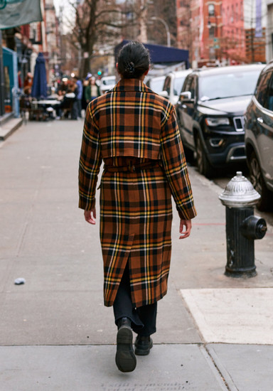 1.Човек кој стои на тротоар.Има кратка црна коса и носи црн шал, сино-кафено карирано палто врз широки беж и маслинесто-зелени слоеви зелени чевли.