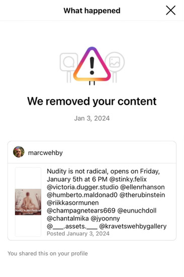 На една галерија во Њујорк, која во моментов прикажува изложба со цел да ја десексуализира концепцијата за голотија, Инстаграм профилот и́ беше избришан поради ... објавување на уметничко дело што прикажува голо тело.